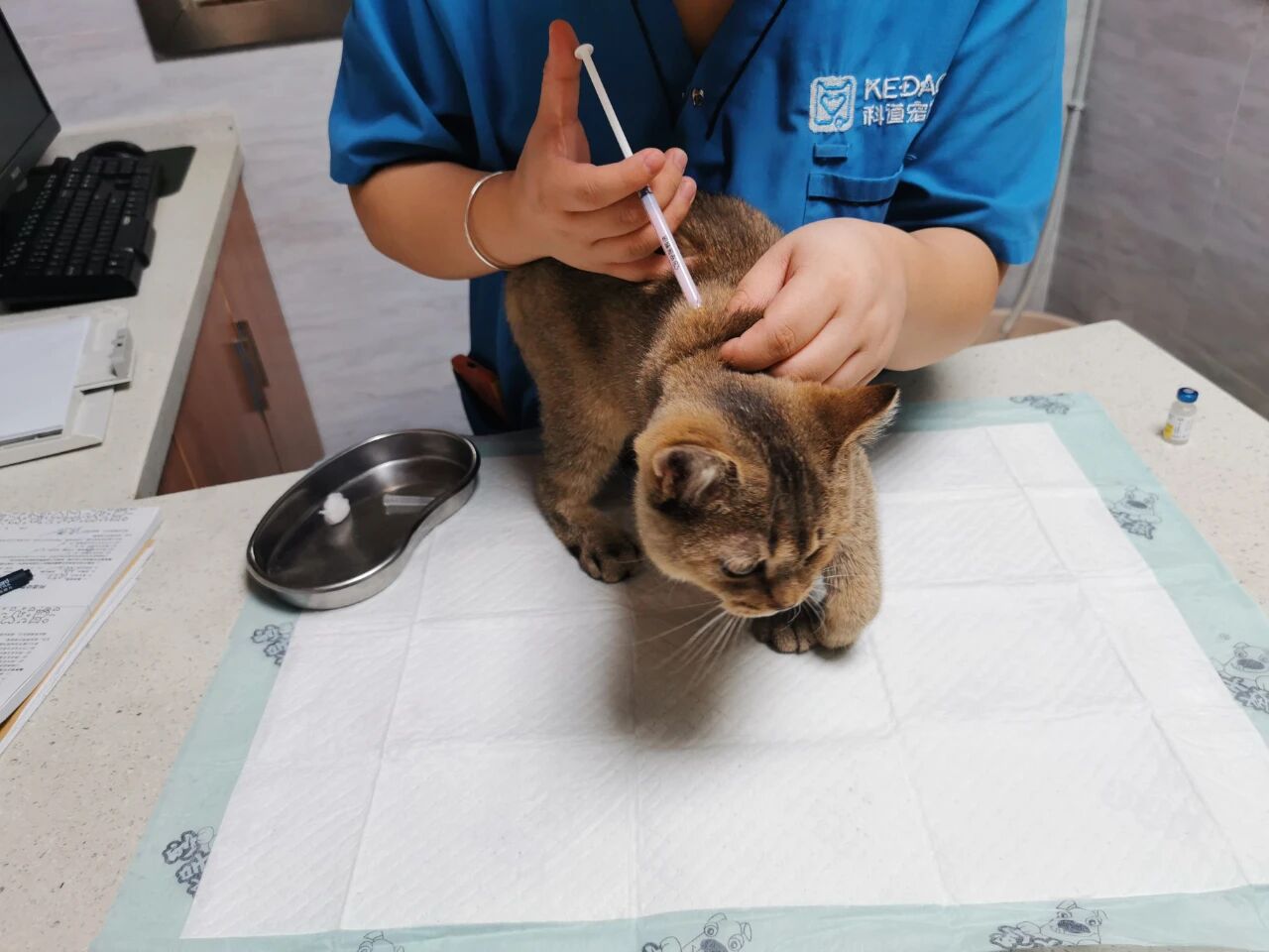 Der Tierarzt untersuchte die Katze und stellte Schwellungen und eine Verletzung am rechten Hinterbein fest, aber es wurde kein Bruch gefunden. Die Katze ist ein 4 Monate altes Männchen (orange und weiß).